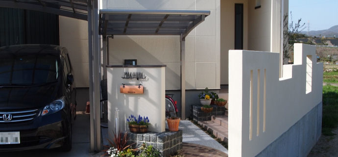リズミカルナ白い壁 白い壁使ってインパクトのあるアプローチをデザインしました。大きな開口部には薔薇などのつる性の植物用のフェンスを組み込みました。 お問い合わせ CONTACT US
